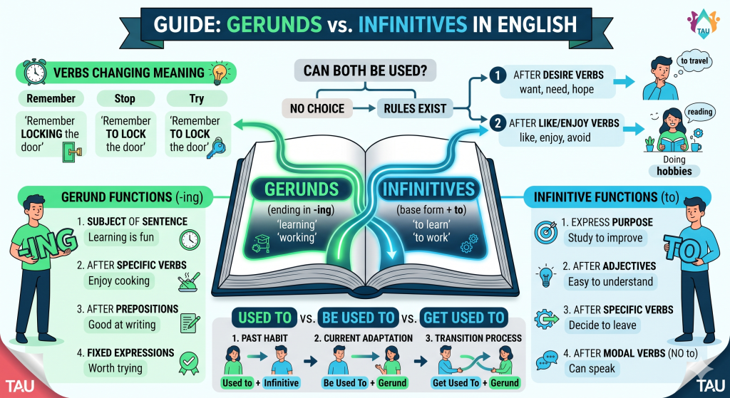 Dominar el uso del gerundio y el infinitivo es uno de esos saltos de calidad que marcan la diferencia entre un inglés funcional y un inglés verdaderamente fluido. Si quieres consolidar estas estructuras con práctica real y acompañamiento personalizado, en TAU contamos con cursos adaptados a todos los niveles para que avances de forma rápida y efectiva. [Descubre nuestros cursos de inglés] y empieza hoy mismo.