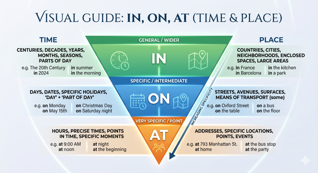 Estas tres preposiciones merecen una mención especial, ya que son las más utilizadas en inglés y también las que generan más confusión. La clave está en entender el nivel de concreción de cada una: